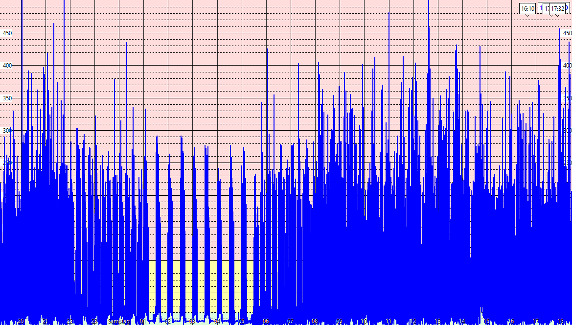 Ich lese die Geräte später bei mir im Büro aus und erstelle den Messbericht. Sie erhalten im Messbericht Grafiken über den zeitlichen Verlauf der Belastungen während des Tages und der Nacht.